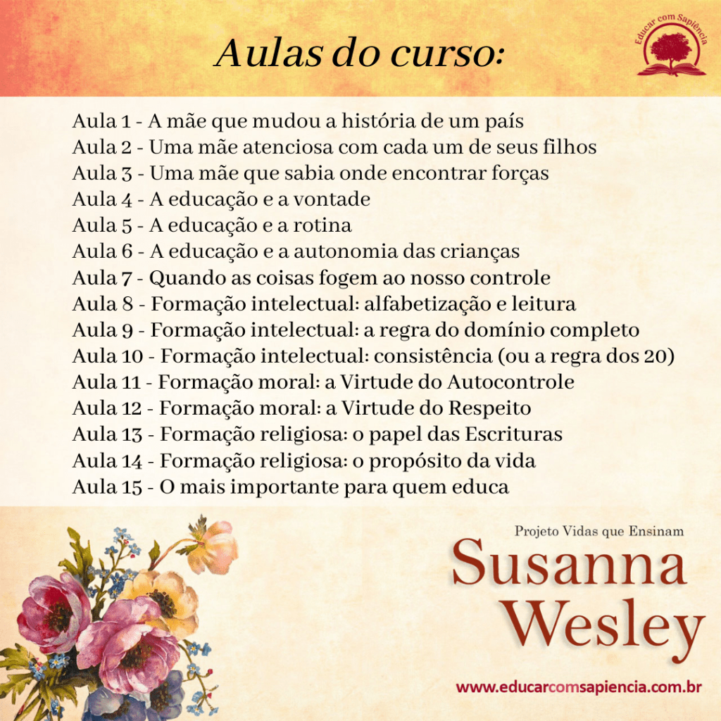 Susana Wesley foi uma mulher culta, determinada e temente a Deus que criou um sistema educativo incrível que mudou um país. Seu sistema não foi implantado nas escolas, nem ficou famoso. Mas ele foi aplicado de forma consistente em sua própria casa ao longo de 20 anos com seus 10 filhos. E foi responsável por criar homens e mulheres não somente extremamente capacitados, mas – especialmente – piedosos e firmes em suas convicções cristãs a ponto de criarem um movimento que se espalhou pelo país e pelo mundo.