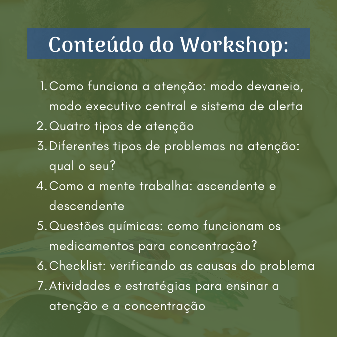 BÔNUS: Ao adquirir o Workshop, receba também o material com exercícios já prontos para trabalhar a atenção e a concentração das crianças. São duas apostilas – uma para crianças em fase de alfabetização e outra para crianças já com leitura fluente – cada uma com 14 exercícios.