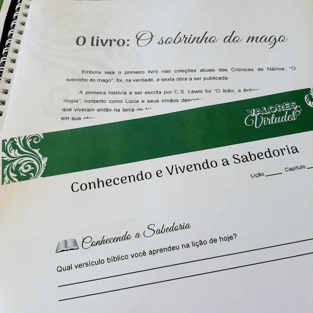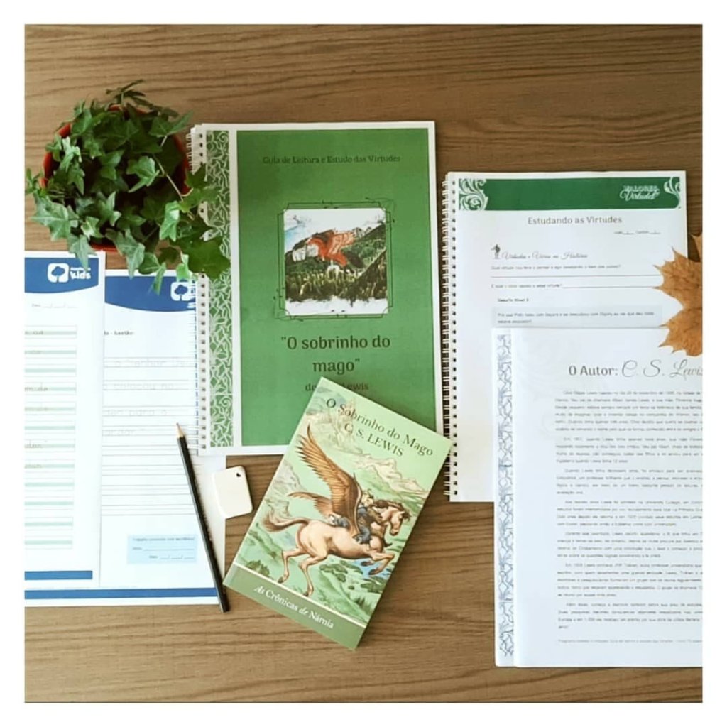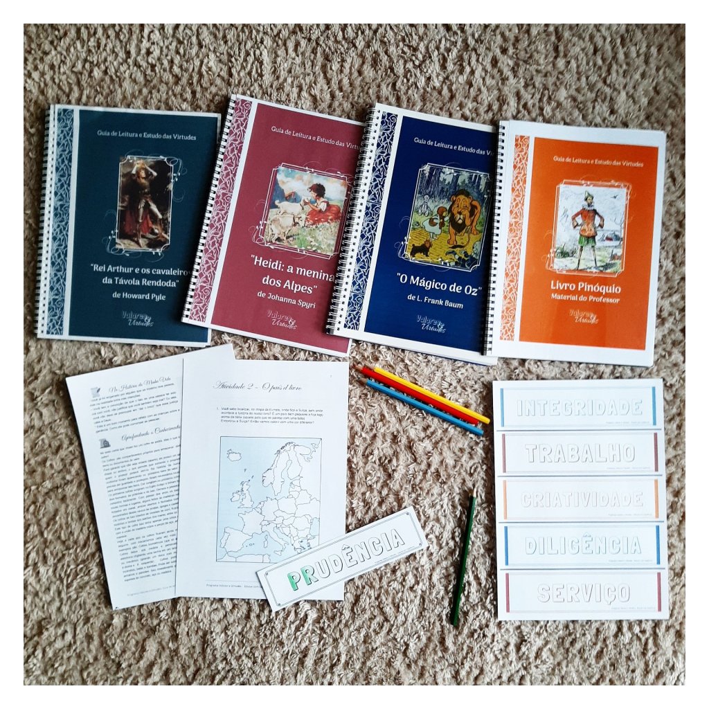 3. Um material do Programa Valores e Virtudes (aqui você pode escolher uma opção: A) Estudo das Virtudes Volume 1, B) Estudo das Virtudes Volume 2, C) material do Pinóquio, D) material da Heidi, E) material O mágico de Oz, F) material O Rei Arthur, G) material O jovem fazendeiro, H) material O leão, a feiticeira e o guarda-roupa.
