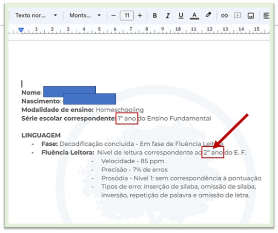 No relatório, indicaremos a Idade de Leitura correspondente, e os tipos de exercícios que precisam ser realizados (se for o caso).