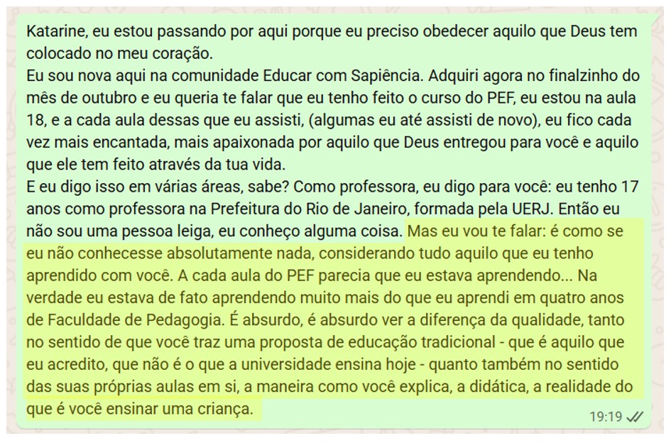 Inclusive, no final do ano agora eu recebi a mensagem da Glauciane, uma professora que chegou recentemente na Academia. Ela me autorizou compartilhar então vou colocar aqui um trecho: