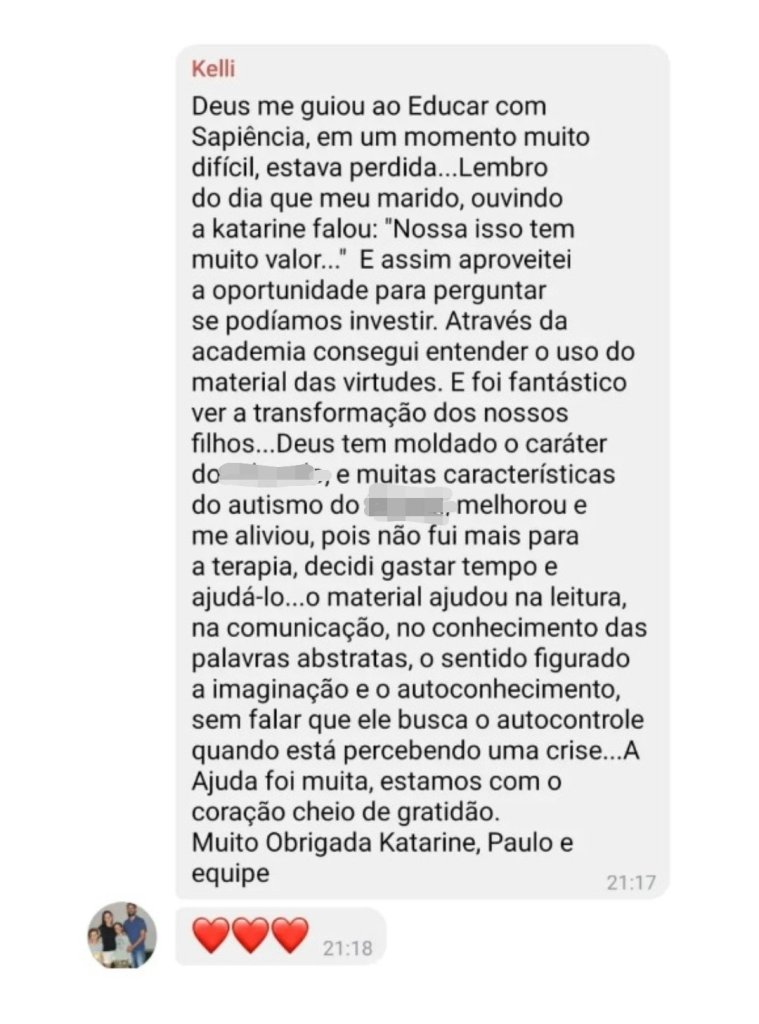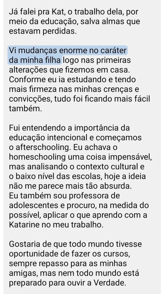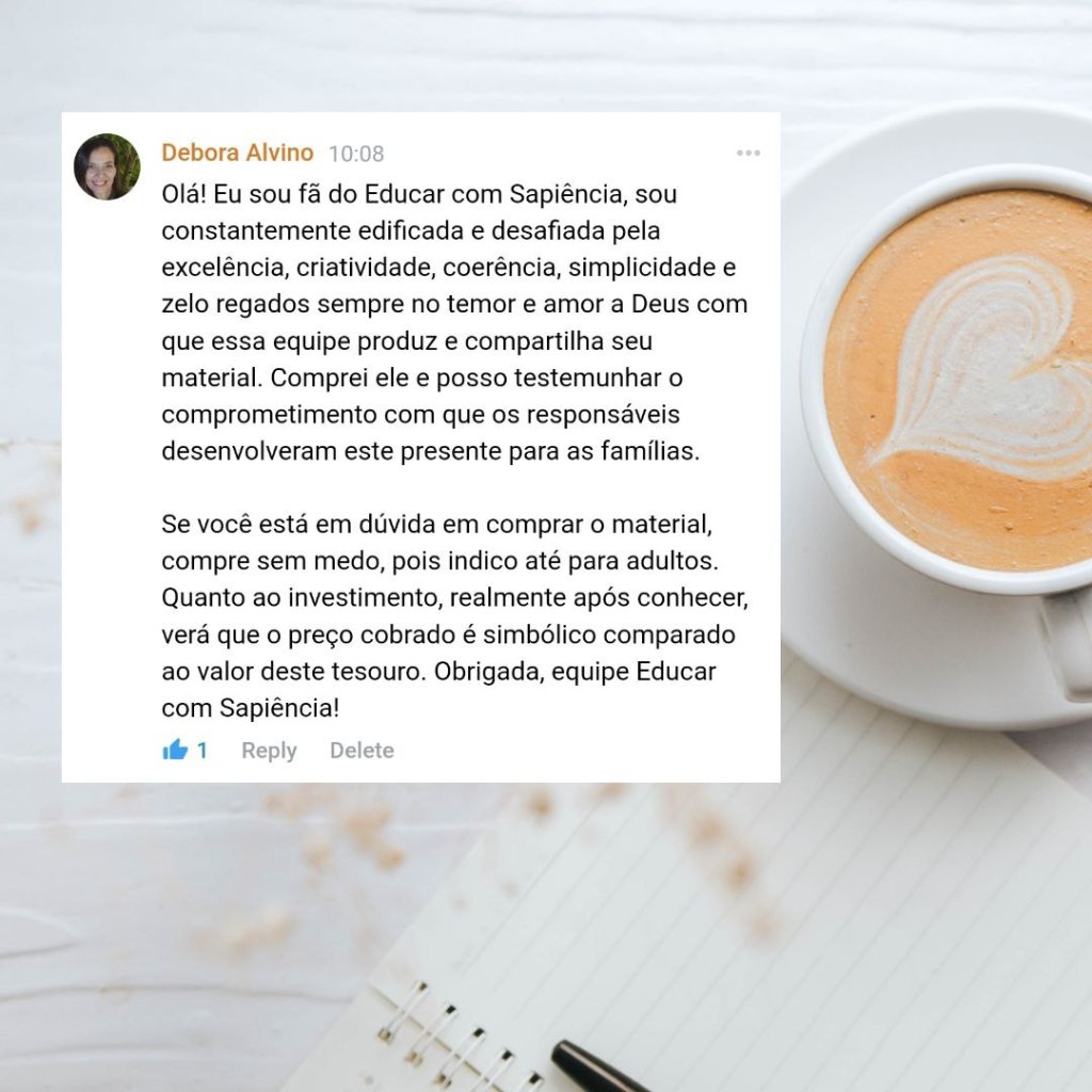 Para quem tem interesse no Programa: Esse material ainda é, hoje, de uso exclusivo para o atendimento às famílias que eu atendo na Tutoria Individual, que custa 3.900,00 por um período de seis meses. Mas exclusivamente em janeiro, nós vamos liberar esse programa para os alunos da Academia Educar com Sapiência, porque quero que nossos alunos sejam os pais e professores bem preparados e confiantes para ensinar uma geração de crianças com uma formação excelente – tanto no acadêmico quanto nas questões de caráter, fé e virtudes.