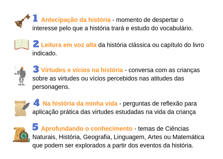 A partir da leitura de uma das histórias ou livros indicados pelo programa, você utilizará o material do Programa Valores e Virtudes para organizar seu trabalho com as crianças em cinco passos: