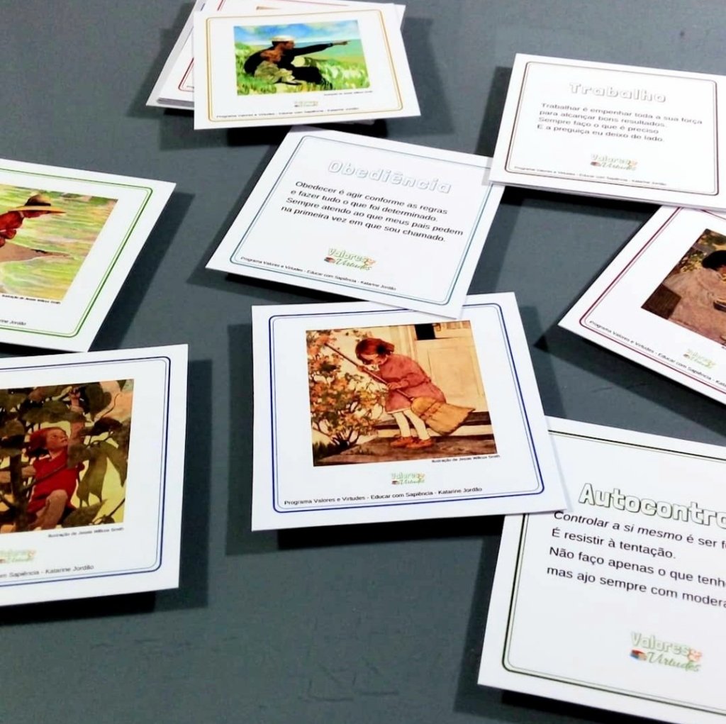 (Se você ainda não adquiriu os cartões das virtudes corre lá, porque tem um vídeo onde eu explico a “historinha” das imagens de cada cartão para motivar as crianças a colocar em prática também. =)
